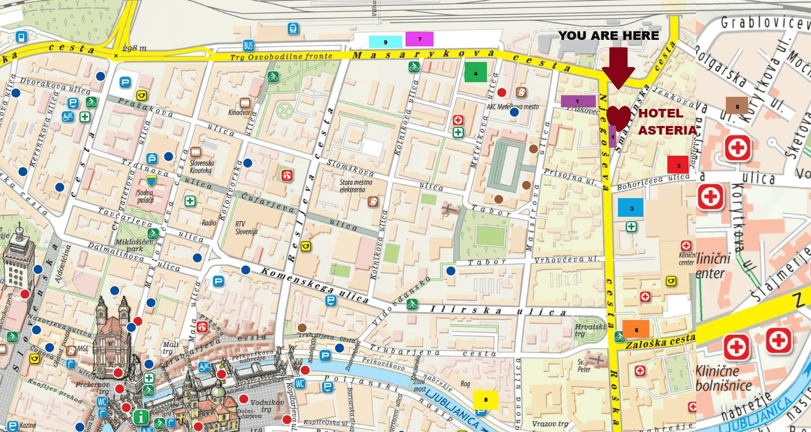 You can find us in the very center of Ljubljana, which is mostly pedestrian zone. Read the tips below or contact us for more information on e-mail info@hotel-asteria.com or telephone number 00 386 41 542 444.